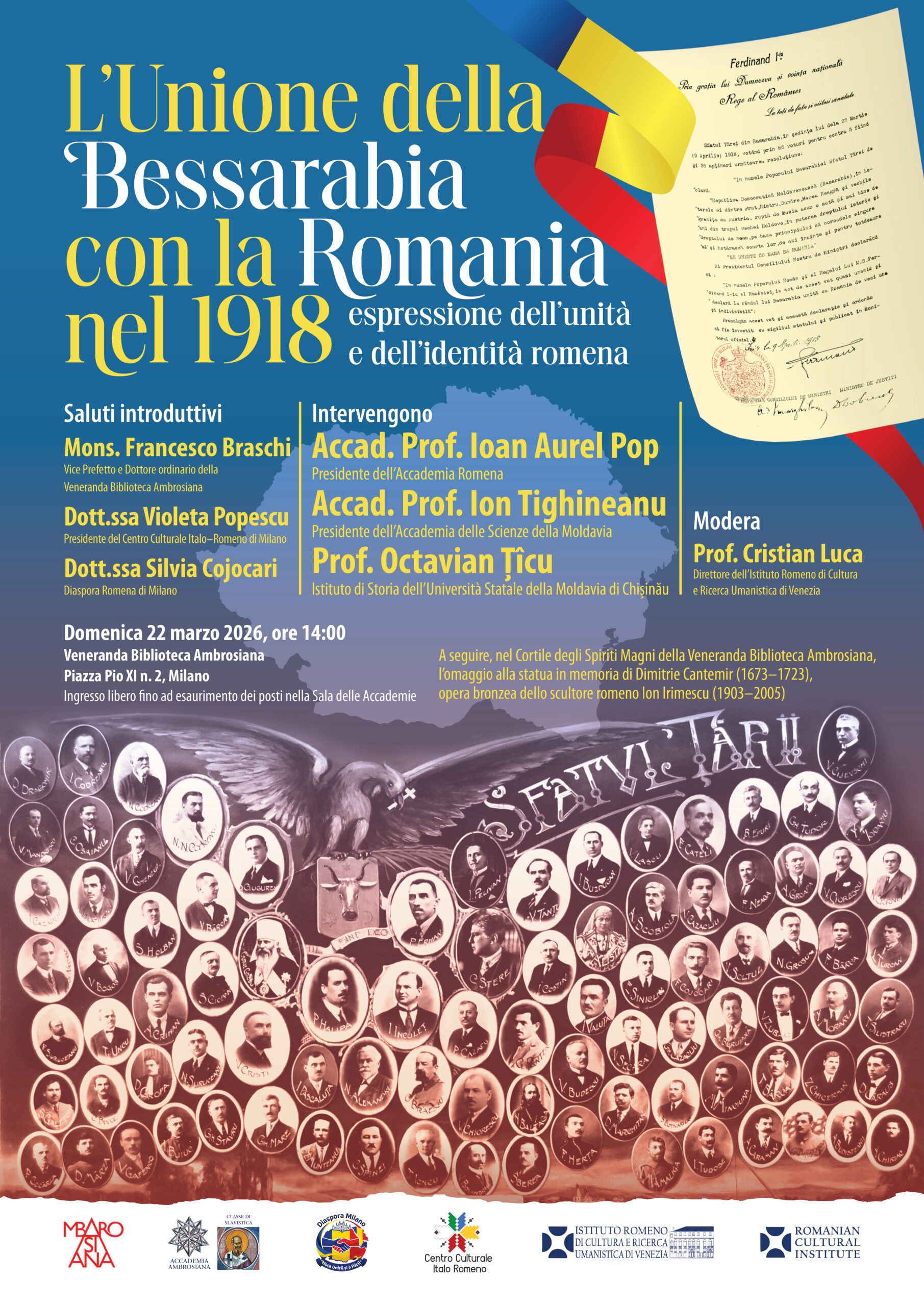 Simpozionul „Unirea Basarabiei cu România la 1918, expresie a unităţii şi identităţii românilor”, prilejuit de marcarea momentului istoric al Unirii Basarabiei cu România (27 martie 1918), va avea loc duminică, 22 martie 2026, începând cu ora 14:00, în Sala delle Accademie a Bibliotecii Ambrosiana din Milano. Manifestarea cultural–ştiinţifică este organizată de diaspora română din Milano, Centrul Cultural Italo–Român din Milano şi Institutul Român de Cultură şi Cercetare Umanistică de la Veneţia, în colaborare cu Biblioteca Ambrosiana. În cadrul simpozionului, vor susţine alocuţiuni cu privire la evenimentele din anului 1918, situaţia Basarabiei în contextul istoric al Unirii cu România, în martie 1918, şi importanţa Unirii ca prim pas întreprins pentru desăvârşirea României Mari, invitaţi de seamă, cărturari cu reputaţie internaţională aflaţi la conducerea celor mai înalte foruri ştiinţifice şi culturale din România şi Republica Moldova: Acad. Prof. univ. dr. Ioan Aurel Pop, Preşedintele Academiei Române; Acad. Prof. univ. dr. Ion Tighineanu, Preşedintele Academiei de Ştiinţe a Moldovei; precum şi cunoscutul istoric Conf. univ. dr. Octavian Ţîcu, de la Institutul de Istorie al Universităţii de Stat din Moldova de la Chişinău. În deschiderea manifestării cultural–ştiinţifice, vor susţine un cuvânt de salut: Monseniorul Francesco Braschi, viceprefect al Bibliotecii Ambrosiana; Dr. Violeta Popescu, preşedintele Centrului Cultural Italo–Român din Milano şi doamna Silvia Cojocari, reprezentantă a diasporei române din Milano. Lucrările simpozionului vor fi moderate de Prof. univ. dr. Cristian Luca, directorul Institutului Român de Cultură şi Cercetare Umanistică de la Veneţia.